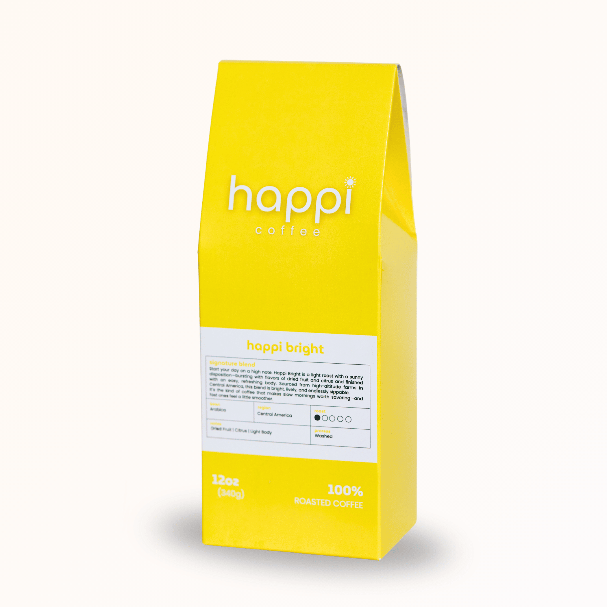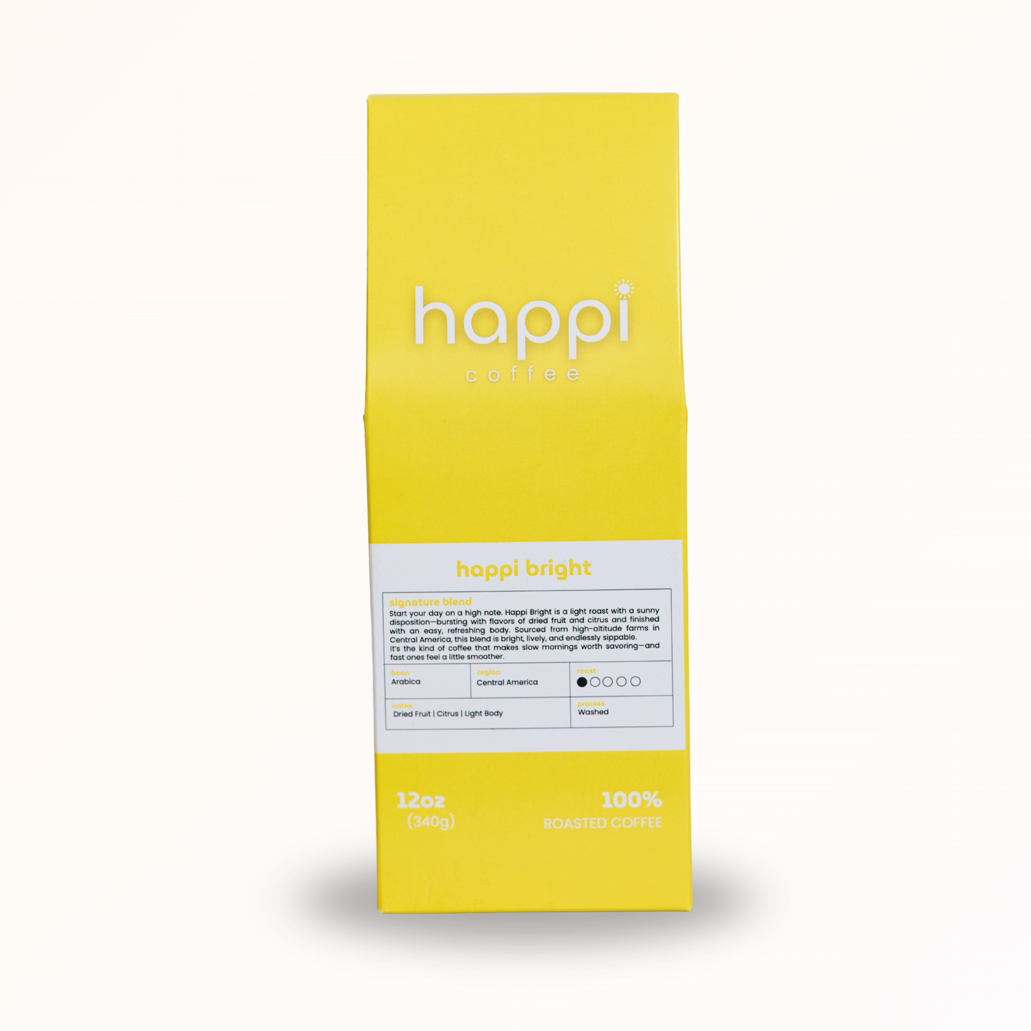 Crisp, vibrant, and feel-good from the first sip—Happi Bright is our signature light roast coffee blend crafted for drinkers who love flavor without bitterness. With notes of honeyed citrus, soft stone fruit, and a gentle floral lift, this smooth, approachable roast hits that sweet spot: bold enough for seasoned coffee lovers, yet bright and balanced for anyone just starting their specialty coffee journey.